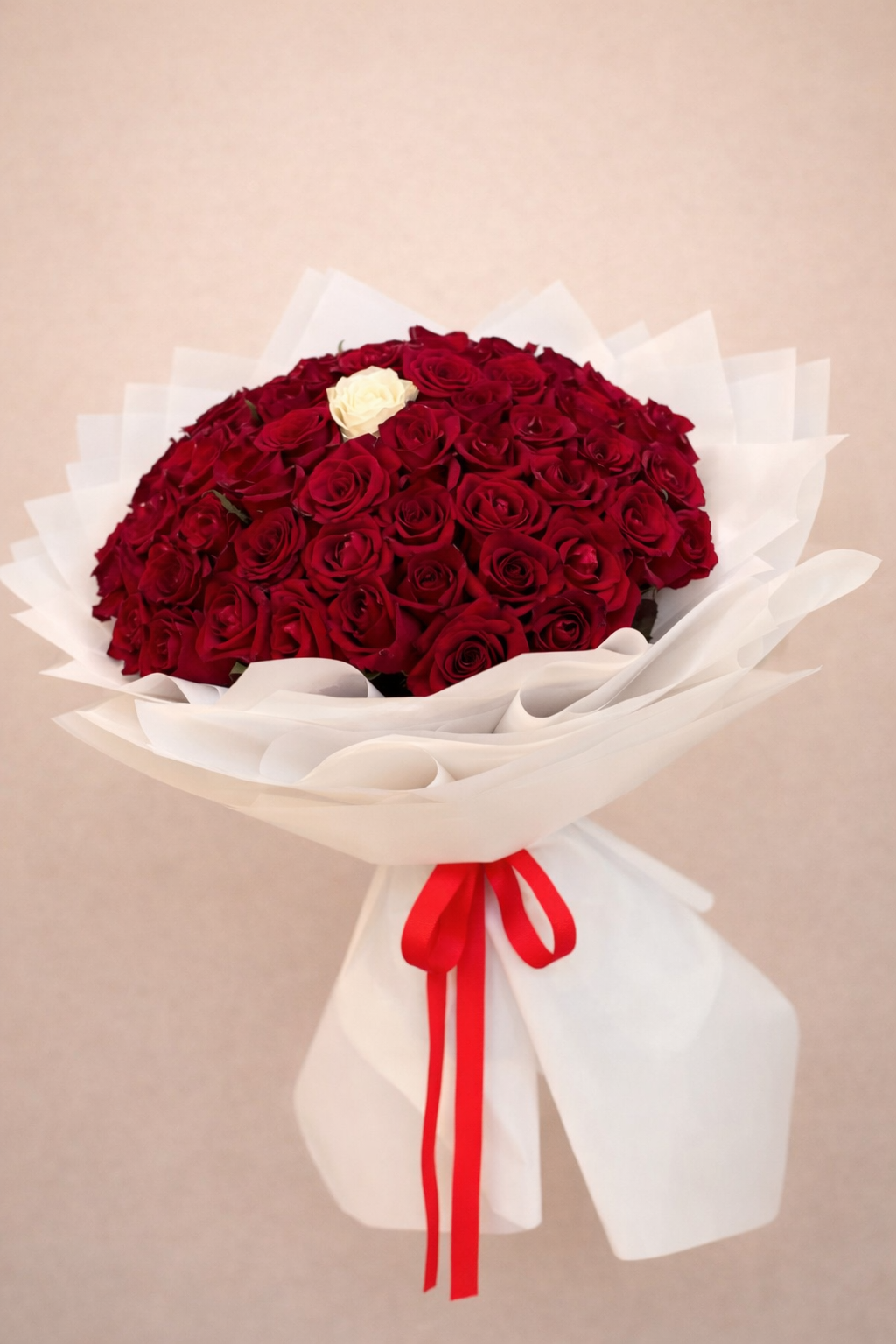 50 red roses and 1 white rose in the center of the bouquet